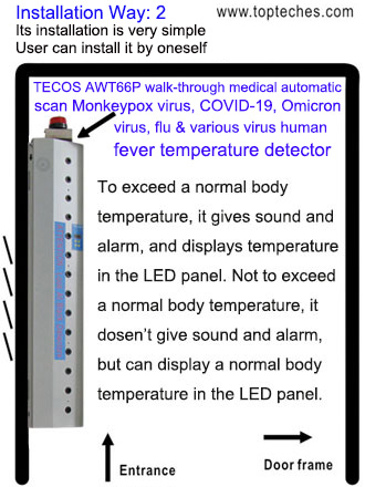 AWT66P body fever temperature detectors are being widely used in airports, schools, courts, Customs, churches, embassies, banks, factories, prisons, hospitals, hotels etc. to detect human body fevers of infecting Ebola virus, Omicron virus, COVID-19 virus, Dengue Fever virus, CHIKV, Swine flu, Monkeypox virus, flu and various viruses to prevent their infections to people. It is very suitable for large flow of people in the public to rapidly detect their body fever temperatures. Optional Some installation ways as follows: